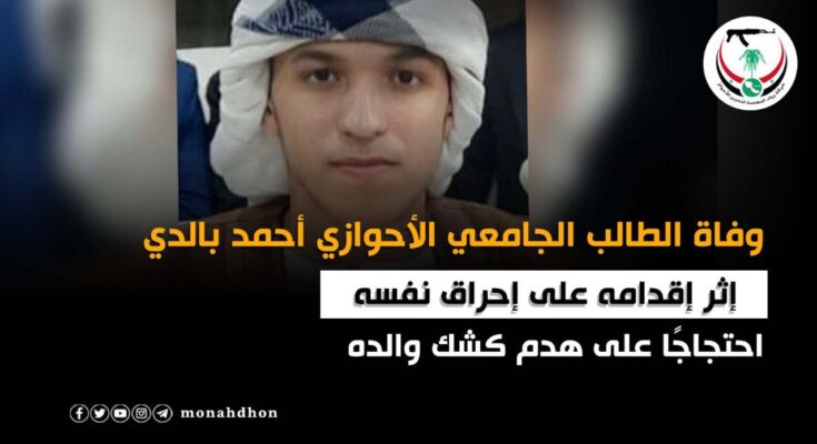 وفاة الطالب الجامعي الأحوازي أحمد بالدي إثر إقدامه على إحراق نفسه احتجاجًا على هدم كشك والده