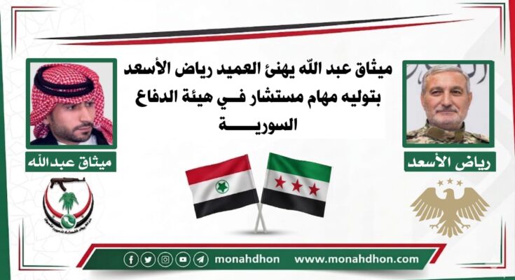 بعث رئيس حركة رواد النهضة لتحرير الأحواز، السيد ميثاق عبد الله، برقية تهنئة إلى سعادة العميد رياض الأسعد، وذلك بمناسبة صدور قرار تعيينه مستشاراً في هيئة الدفاع السورية.