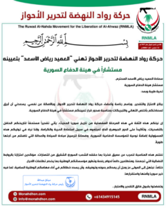 واختتم رئيس الحركة برقيته بالدعاء للعميد رياض الأسعد بالتوفيق والسداد في مهامه الوطنية، متمنياً لسوريا الأمن والاستقرار والازدهار.